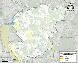 Le retrait-gonflement des sols argileux est susceptible d'engendrer des dommages importants aux bâtiments en cas d’alternance de périodes de sécheresse et de pluie. Aucune partie du territoire de la commune n'est en aléa moyen ou fort (26,8 % au niveau départemental et 48,5 % au niveau national). Sur les 597 bâtiments dénombrés sur la commune en 2019, aucun n'est en aléa moyen ou fort, à comparer aux 36 % au niveau départemental et 54 % au niveau national. Une cartographie de l'exposition du territoire national au retrait gonflement des sols argileux est disponible sur le site du BRGM[17],[Carte 2].