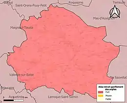 Le retrait-gonflement des sols argileux est susceptible d'engendrer des dommages importants aux bâtiments en cas d’alternance de périodes de sécheresse et de pluie. La totalité de la commune est en aléa moyen ou fort (94,5 % au niveau départemental et 48,5 % au niveau national). Sur les 374 bâtiments dénombrés sur la commune en 2019, 374 sont en aléa moyen ou fort, soit 100 %, à comparer aux 93 % au niveau départemental et 54 % au niveau national. Une cartographie de l'exposition du territoire national au retrait gonflement des sols argileux est disponible sur le site du BRGM[20],[Carte 3].