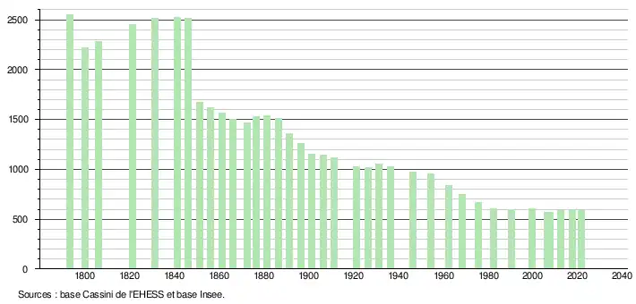 L'évolution du nombre d'habitants est connue à travers les recensements de la population effectués dans la commune depuis 1793. Pour les communes de moins de 10 000 habitants, une enquête de recensement portant sur toute la population est réalisée tous les cinq ans, les populations légales des années intermédiaires étant quant à elles estimées par interpolation ou extrapolation[25]. Pour la commune, le premier recensement exhaustif entrant dans le cadre du nouveau dispositif a été réalisé en 2007[26].