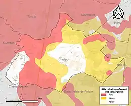 Le retrait-gonflement des sols argileux est susceptible d'engendrer des dommages importants aux bâtiments en cas d’alternance de périodes de sécheresse et de pluie. 75 % de la superficie communale est en aléa moyen ou fort (54,2 % au niveau départemental et 48,5 % au niveau national). Sur les 172 bâtiments dénombrés sur la commune en 2019, 58 sont en aléa moyen ou fort, soit 34 %, à comparer aux 57 % au niveau départemental et 54 % au niveau national. Une cartographie de l'exposition du territoire national au retrait gonflement des sols argileux est disponible sur le site du BRGM[11],[Carte 2].