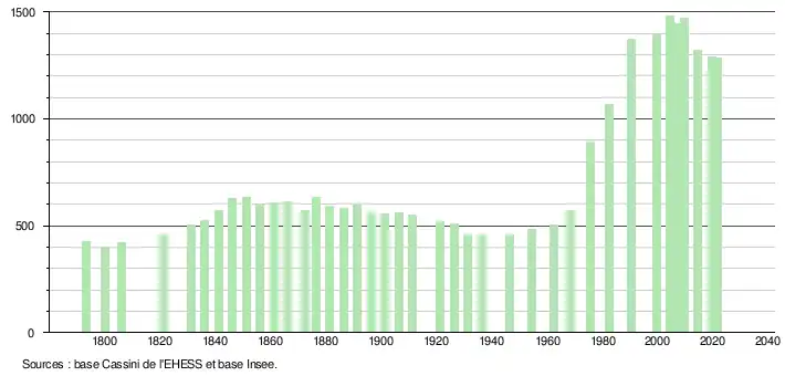 L'évolution du nombre d'habitants est connue à travers les recensements de la population effectués dans la commune depuis 1793. Pour les communes de moins de 10 000 habitants, une enquête de recensement portant sur toute la population est réalisée tous les cinq ans, les populations légales des années intermédiaires étant quant à elles estimées par interpolation ou extrapolation[25]. Pour la commune, le premier recensement exhaustif entrant dans le cadre du nouveau dispositif a été réalisé en 2004[26].