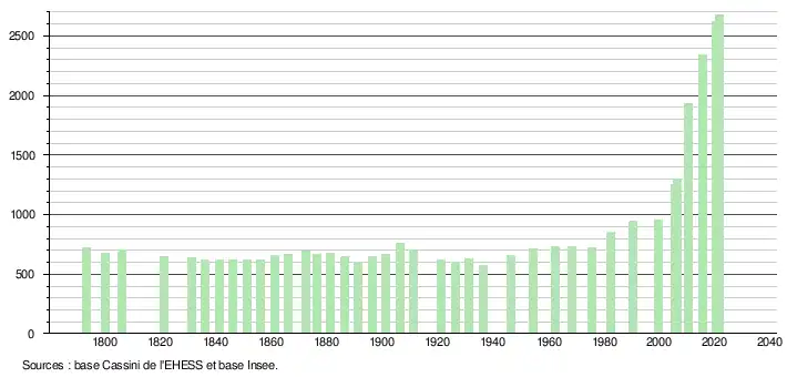 | L'évolution du nombre d'habitants est connue à travers les recensements de la population effectués dans la commune depuis 1793. Pour les communes de moins de 10 000 habitants, une enquête de recensement portant sur toute la population est réalisée tous les cinq ans, les populations légales des années intermédiaires étant quant à elles estimées par interpolation ou extrapolation[36]. Pour la commune, le premier recensement exhaustif entrant dans le cadre du nouveau dispositif a été réalisé en 2005[37]. En 2021, la commune comptait 2 675 habitants[Note 3], en augmentation de 14,32 % par rapport à 2015 (Gironde : +6,88 %, France hors Mayotte : +1,84 %). |