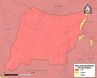 Le retrait-gonflement des sols argileux est susceptible d'engendrer des dommages importants aux bâtiments en cas d’alternance de périodes de sécheresse et de pluie. La totalité de la commune est en aléa moyen ou fort (67,4 % au niveau départemental et 48,5 % au niveau national). Sur les 742 bâtiments dénombrés sur la commune en 2019, 742 sont en aléa moyen ou fort, soit 100 %, à comparer aux 84 % au niveau départemental et 54 % au niveau national. Une cartographie de l'exposition du territoire national au retrait gonflement des sols argileux est disponible sur le site du BRGM[23],[Carte 2].
