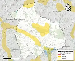 Le retrait-gonflement des sols argileux est susceptible d'engendrer des dommages importants aux bâtiments en cas d’alternance de périodes de sécheresse et de pluie. 17,2 % de la superficie communale est en aléa moyen ou fort (67,4 % au niveau départemental et 48,5 % au niveau national). Sur les 132 bâtiments dénombrés sur la commune en 2019, 14 sont en aléa moyen ou fort, soit 11 %, à comparer aux 81 % au niveau départemental et 54 % au niveau national. Une cartographie de l'exposition du territoire national au retrait gonflement des sols argileux est disponible sur le site du BRGM[20],[Carte 3].