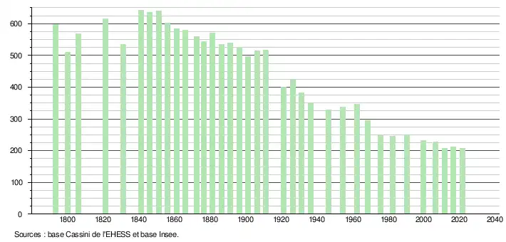 L'évolution du nombre d'habitants est connue à travers les recensements de la population effectués dans la commune depuis 1793. Pour les communes de moins de 10 000 habitants, une enquête de recensement portant sur toute la population est réalisée tous les cinq ans, les populations légales des années intermédiaires étant quant à elles estimées par interpolation ou extrapolation[35]. Pour la commune, le premier recensement exhaustif entrant dans le cadre du nouveau dispositif a été réalisé en 2006[36].