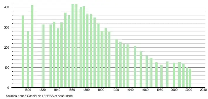 L'évolution du nombre d'habitants est connue à travers les recensements de la population effectués dans la commune depuis 1793. Pour les communes de moins de 10 000 habitants, une enquête de recensement portant sur toute la population est réalisée tous les cinq ans, les populations légales des années intermédiaires étant quant à elles estimées par interpolation ou extrapolation[14]. Pour la commune, le premier recensement exhaustif entrant dans le cadre du nouveau dispositif a été réalisé en 2007[15].