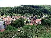Saint-Quirin : église prieurale avec à l'arrière-plan la Chapelle-Haute.