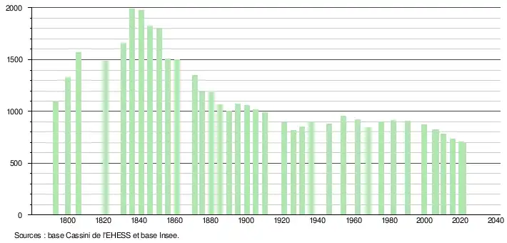 L'évolution du nombre d'habitants est connue à travers les recensements de la population effectués dans la commune depuis 1793. Pour les communes de moins de 10 000 habitants, une enquête de recensement portant sur toute la population est réalisée tous les cinq ans, les populations légales des années intermédiaires étant quant à elles estimées par interpolation ou extrapolation[17]. Pour la commune, le premier recensement exhaustif entrant dans le cadre du nouveau dispositif a été réalisé en 2005[18].