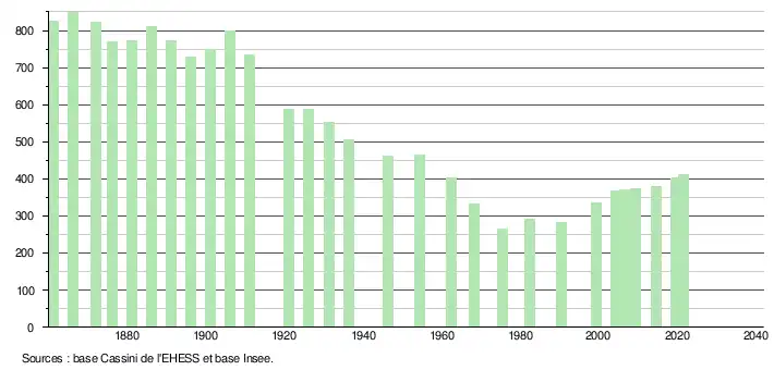 L'évolution du nombre d'habitants est connue à travers les recensements de la population effectués dans la commune depuis 1861. Pour les communes de moins de 10 000 habitants, une enquête de recensement portant sur toute la population est réalisée tous les cinq ans, les populations légales des années intermédiaires étant quant à elles estimées par interpolation ou extrapolation[16]. Pour la commune, le premier recensement exhaustif entrant dans le cadre du nouveau dispositif a été réalisé en 2004[17].