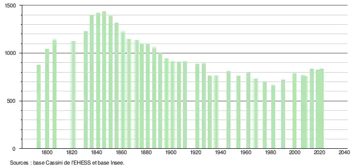 L'évolution du nombre d'habitants est connue à travers les recensements de la population effectués dans la commune depuis 1793. Pour les communes de moins de 10 000 habitants, une enquête de recensement portant sur toute la population est réalisée tous les cinq ans, les populations légales des années intermédiaires étant quant à elles estimées par interpolation ou extrapolation[20]. Pour la commune, le premier recensement exhaustif entrant dans le cadre du nouveau dispositif a été réalisé en 2008[21].