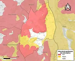 Les mouvements de terrains susceptibles de se produire sur la commune sont des affaissements et effondrements liés aux cavités souterraines (hors mines) et des tassements différentiels[21]. Afin de mieux appréhender le risque d’affaissement de terrain, un inventaire national permet de localiser les éventuelles cavités souterraines sur la commune[22]. Le retrait-gonflement des sols argileux est susceptible d'engendrer des dommages importants aux bâtiments en cas d’alternance de périodes de sécheresse et de pluie[23]. 87,4 % de la superficie communale est en aléa moyen ou fort (79,5 % au niveau départemental et 48,5 % au niveau national)[Carte 2]. Depuis le , en application de la loi ÉLAN, différentes contraintes s'imposent aux vendeurs, maîtres d'ouvrages ou constructeurs de biens situés dans une zone classée en aléa moyen ou fort[Note 5],[24].