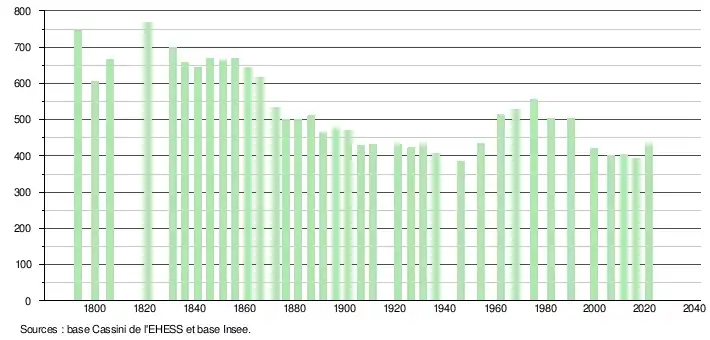 L'évolution du nombre d'habitants est connue à travers les recensements de la population effectués dans la commune depuis 1793. Pour les communes de moins de 10 000 habitants, une enquête de recensement portant sur toute la population est réalisée tous les cinq ans, les populations légales des années intermédiaires étant quant à elles estimées par interpolation ou extrapolation[29]. Pour la commune, le premier recensement exhaustif entrant dans le cadre du nouveau dispositif a été réalisé en 2006[30].