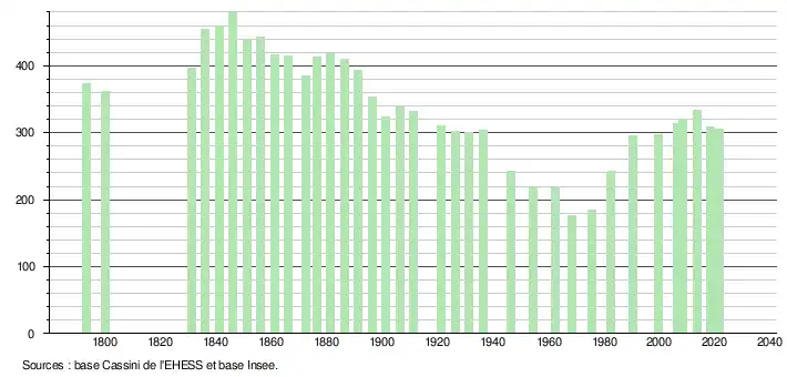 L'évolution du nombre d'habitants est connue à travers les recensements de la population effectués dans la commune depuis 1793. Pour les communes de moins de 10 000 habitants, une enquête de recensement portant sur toute la population est réalisée tous les cinq ans, les populations légales des années intermédiaires étant quant à elles estimées par interpolation ou extrapolation[44]. Pour la commune, le premier recensement exhaustif entrant dans le cadre du nouveau dispositif a été réalisé en 2008[45].