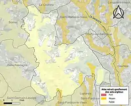 Le retrait-gonflement des sols argileux est susceptible d'engendrer des dommages importants aux bâtiments en cas d’alternance de périodes de sécheresse et de pluie. 2,9 % de la superficie communale est en aléa moyen ou fort (26,8 % au niveau départemental et 48,5 % au niveau national). Sur les 168 bâtiments dénombrés sur la commune en 2019, aucun n'est en aléa moyen ou fort, à comparer aux 36 % au niveau départemental et 54 % au niveau national. Une cartographie de l'exposition du territoire national au retrait gonflement des sols argileux est disponible sur le site du BRGM[17],[Carte 2].