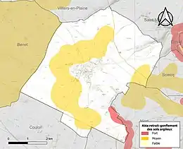 Les mouvements de terrains susceptibles de se produire sur la commune sont des tassements différentiels[16]. Le retrait-gonflement des sols argileux est susceptible d'engendrer des dommages importants aux bâtiments en cas d’alternance de périodes de sécheresse et de pluie[17]. 31 % de la superficie communale est en aléa moyen ou fort (54,9 % au niveau départemental et 48,5 % au niveau national)[Carte 2]. Depuis le , en application de la loi ELAN, différentes contraintes s'imposent aux vendeurs, maîtres d'ouvrages ou constructeurs de biens situés dans une zone classée en aléa moyen ou fort[Note 3],[18].