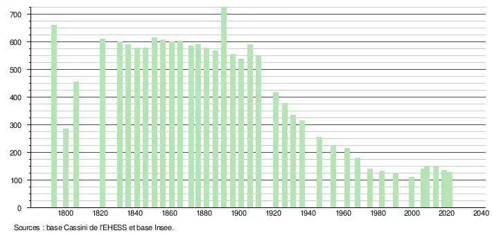 L'évolution du nombre d'habitants est connue à travers les recensements de la population effectués dans la commune depuis 1793. Pour les communes de moins de 10 000 habitants, une enquête de recensement portant sur toute la population est réalisée tous les cinq ans, les populations légales des années intermédiaires étant quant à elles estimées par interpolation ou extrapolation[13]. Pour la commune, le premier recensement exhaustif entrant dans le cadre du nouveau dispositif a été réalisé en 2008[14].