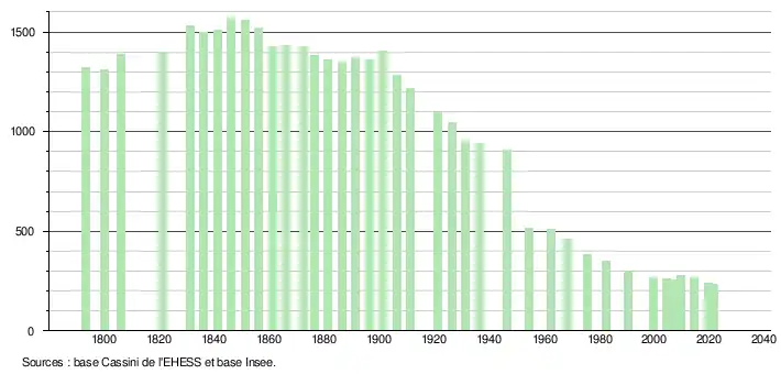 L'évolution du nombre d'habitants est connue à travers les recensements de la population effectués dans la commune depuis 1793. Pour les communes de moins de 10 000 habitants, une enquête de recensement portant sur toute la population est réalisée tous les cinq ans, les populations légales des années intermédiaires étant quant à elles estimées par interpolation ou extrapolation[14]. Pour la commune, le premier recensement exhaustif entrant dans le cadre du nouveau dispositif a été réalisé en 2004[15].