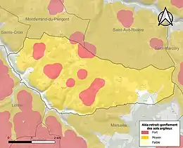 Les mouvements de terrains susceptibles de se produire sur la commune sont des tassements différentiels[35]. Le retrait-gonflement des sols argileux est susceptible d'engendrer des dommages importants aux bâtiments en cas d’alternance de périodes de sécheresse et de pluie[36]. 89,7 % de la superficie communale est en aléa moyen ou fort (58,6 % au niveau départemental et 48,5 % au niveau national métropolitain)[Carte 4]. Depuis le , en application de la loi ÉLAN, différentes contraintes s'imposent aux vendeurs, maîtres d'ouvrages ou constructeurs de biens situés dans une zone classée en aléa moyen ou fort[Note 4],[37].
