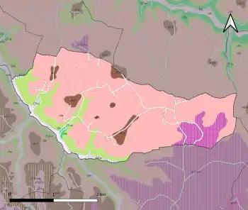 L'occupation des sols de la commune, telle qu'elle ressort de la base de données européenne d’occupation biophysique des sols Corine Land Cover (CLC), est marquée par l'importance des forêts et milieux semi-naturels (66,6 % en 2018), une proportion identique à celle de 1990 (66,6 %). La répartition détaillée en 2018 est la suivante : forêts (66,6 %), zones agricoles hétérogènes (28 %), prairies (5,4 %)[29]. L'évolution de l’occupation des sols de la commune et de ses infrastructures peut être observée sur les différentes représentations cartographiques du territoire : la carte de Cassini (XVIIIe siècle), la carte d'état-major (1820-1866) et les cartes ou photos aériennes de l'IGN pour la période actuelle (1950 à aujourd'hui)[Carte 3].