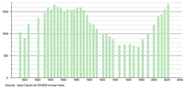 L'évolution du nombre d'habitants est connue à travers les recensements de la population effectués dans la commune depuis 1793. Pour les communes de moins de 10 000 habitants, une enquête de recensement portant sur toute la population est réalisée tous les cinq ans, les populations légales des années intermédiaires étant quant à elles estimées par interpolation ou extrapolation[13]. Pour la commune, le premier recensement exhaustif entrant dans le cadre du nouveau dispositif a été réalisé en 2006[14].