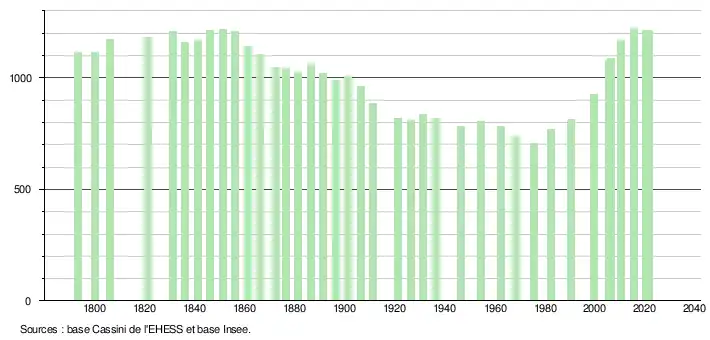 L'évolution du nombre d'habitants est connue à travers les recensements de la population effectués dans la commune depuis 1793. Pour les communes de moins de 10 000 habitants, une enquête de recensement portant sur toute la population est réalisée tous les cinq ans, les populations légales des années intermédiaires étant quant à elles estimées par interpolation ou extrapolation[19]. Pour la commune, le premier recensement exhaustif entrant dans le cadre du nouveau dispositif a été réalisé en 2005[20].