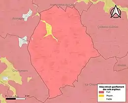 Les mouvements de terrains susceptibles de se produire sur la commune sont des tassements différentiels[16]. Le retrait-gonflement des sols argileux est susceptible d'engendrer des dommages importants aux bâtiments en cas d’alternance de périodes de sécheresse et de pluie[17]. La totalité de la commune est en aléa moyen ou fort (79,5 % au niveau départemental et 48,5 % au niveau national)[Carte 2]. Depuis le , en application de la loi ÉLAN, différentes contraintes s'imposent aux vendeurs, maîtres d'ouvrages ou constructeurs de biens situés dans une zone classée en aléa moyen ou fort[Note 2],[18].
