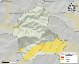 La commune est vulnérable au risque de mouvements de terrains constitué principalement du retrait-gonflement des sols argileux[16]. Cet aléa est susceptible d'engendrer des dommages importants aux bâtiments en cas d’alternance de périodes de sécheresse et de pluie. 22,4 % de la superficie communale est en aléa moyen ou fort (67,5 % au niveau départemental et 48,5 % au niveau national). Sur les 174 bâtiments dénombrés sur la commune en 2019, 37 sont en aléa moyen ou fort, soit 21 %, à comparer aux 90 % au niveau départemental et 54 % au niveau national. Une cartographie de l'exposition du territoire national au retrait gonflement des sols argileux est disponible sur le site du BRGM[17],[Carte 2].