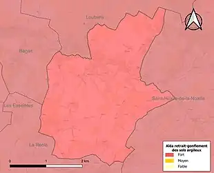 Le retrait-gonflement des sols argileux est susceptible d'engendrer des dommages importants aux bâtiments en cas d’alternance de périodes de sécheresse et de pluie. La totalité de la commune est en aléa moyen ou fort (67,4 % au niveau départemental et 48,5 % au niveau national). Sur les 102 bâtiments dénombrés sur la commune en 2019, 102 sont en aléa moyen ou fort, soit 100 %, à comparer aux 84 % au niveau départemental et 54 % au niveau national. Une cartographie de l'exposition du territoire national au retrait gonflement des sols argileux est disponible sur le site du BRGM[17],[Carte 2].