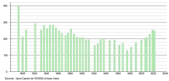 L'évolution du nombre d'habitants est connue à travers les recensements de la population effectués dans la commune depuis 1793. Pour les communes de moins de 10 000 habitants, une enquête de recensement portant sur toute la population est réalisée tous les cinq ans, les populations légales des années intermédiaires étant quant à elles estimées par interpolation ou extrapolation[22]. Pour la commune, le premier recensement exhaustif entrant dans le cadre du nouveau dispositif a été réalisé en 2008[23].