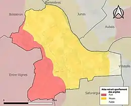 Le retrait-gonflement des sols argileux est susceptible d'engendrer des dommages importants aux bâtiments en cas d’alternance de périodes de sécheresse et de pluie. 94,9 % de la superficie communale est en aléa moyen ou fort (59,3 % au niveau départemental et 48,5 % au niveau national). Sur les 353 bâtiments dénombrés sur la commune en 2019, 353 sont en aléa moyen ou fort, soit 100 %, à comparer aux 85 % au niveau départemental et 54 % au niveau national. Une cartographie de l'exposition du territoire national au retrait gonflement des sols argileux est disponible sur le site du BRGM[20],[Carte 2].