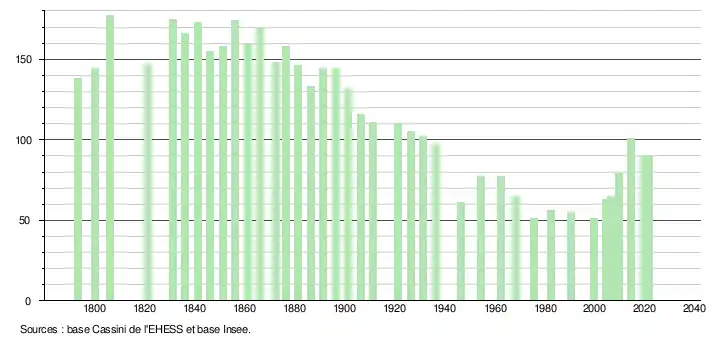 L'évolution du nombre d'habitants est connue à travers les recensements de la population effectués dans la commune depuis 1793. Pour les communes de moins de 10 000 habitants, une enquête de recensement portant sur toute la population est réalisée tous les cinq ans, les populations légales des années intermédiaires étant quant à elles estimées par interpolation ou extrapolation[55]. Pour la commune, le premier recensement exhaustif entrant dans le cadre du nouveau dispositif a été réalisé en 2004[56].