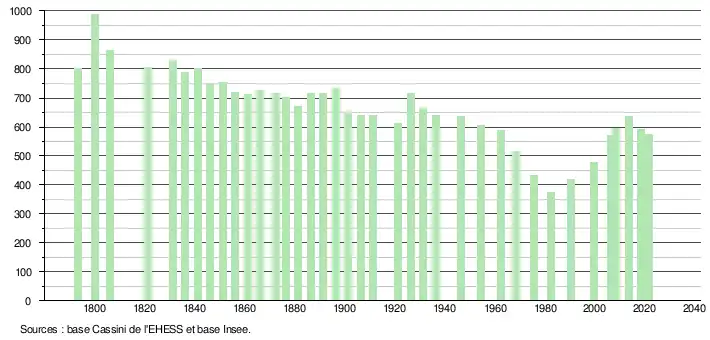L'évolution du nombre d'habitants est connue à travers les recensements de la population effectués dans la commune depuis 1793. Pour les communes de moins de 10 000 habitants, une enquête de recensement portant sur toute la population est réalisée tous les cinq ans, les populations légales des années intermédiaires étant quant à elles estimées par interpolation ou extrapolation[31]. Pour la commune, le premier recensement exhaustif entrant dans le cadre du nouveau dispositif a été réalisé en 2008[32].