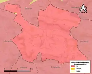 Le retrait-gonflement des sols argileux est susceptible d'engendrer des dommages importants aux bâtiments en cas d’alternance de périodes de sécheresse et de pluie[19]. La totalité de la commune est en aléa moyen ou fort (91,8 % au niveau départemental et 48,5 % au niveau national)[Carte 2]. Depuis le , en application de la loi ELAN, différentes contraintes s'imposent aux vendeurs, maîtres d'ouvrages ou constructeurs de biens situés dans une zone classée en aléa moyen ou fort[Note 4],[20].