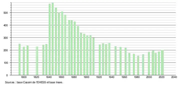 L'évolution du nombre d'habitants est connue à travers les recensements de la population effectués dans la commune depuis 1793. Pour les communes de moins de 10 000 habitants, une enquête de recensement portant sur toute la population est réalisée tous les cinq ans, les populations légales des années intermédiaires étant quant à elles estimées par interpolation ou extrapolation[23]. Pour la commune, le premier recensement exhaustif entrant dans le cadre du nouveau dispositif a été réalisé en 2005[24].