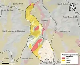 Le retrait-gonflement des sols argileux est susceptible d'engendrer des dommages importants aux bâtiments en cas d’alternance de périodes de sécheresse et de pluie. 46,4 % de la superficie communale est en aléa moyen ou fort (59,3 % au niveau départemental et 48,5 % au niveau national). Sur les 175 bâtiments dénombrés sur la commune en 2019, 95 sont en aléa moyen ou fort, soit 54 %, à comparer aux 85 % au niveau départemental et 54 % au niveau national. Une cartographie de l'exposition du territoire national au retrait gonflement des sols argileux est disponible sur le site du BRGM[19],[Carte 2].