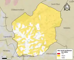 La commune est vulnérable au risque de mouvements de terrains constitué principalement du retrait-gonflement des sols argileux[15]. Cet aléa est susceptible d'engendrer des dommages importants aux bâtiments en cas d’alternance de périodes de sécheresse et de pluie. 74,8 % de la superficie communale est en aléa moyen ou fort (90 % au niveau départemental et 48,5 % au niveau national). Sur les 479 bâtiments dénombrés sur la commune en 2019, 282 sont en aléa moyen ou fort, soit 59 %, à comparer aux 83 % au niveau départemental et 54 % au niveau national. Une cartographie de l'exposition du territoire national au retrait gonflement des sols argileux est disponible sur le site du BRGM[16],[Carte 2].