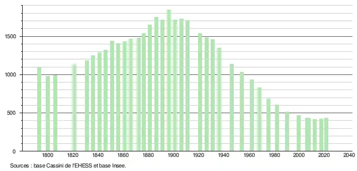 L'évolution du nombre d'habitants est connue à travers les recensements de la population effectués dans la commune depuis 1793. Pour les communes de moins de 10 000 habitants, une enquête de recensement portant sur toute la population est réalisée tous les cinq ans, les populations légales des années intermédiaires étant quant à elles estimées par interpolation ou extrapolation[25]. Pour la commune, le premier recensement exhaustif entrant dans le cadre du nouveau dispositif a été réalisé en 2007[26].