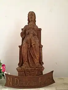 - Nostre Dame des Aydes. Le mobilier subsistant de l'église comporte la statue de Nostre Dame des Aydes, conservée sur l'autel de la chapelle du sud. Découverte par Émile Chénon en 1912, cachée dans le clocher de l'église[32]. Cette statue, haute d'un mètre, représente une Vierge à l'Enfant assise, dont les vêtements étaient peints en rouge pour la Vierge et en bleu pour l'enfant ; elle est en partie mutilée. Ce pourrait être une copie d'une statue du XIVe siècle.
