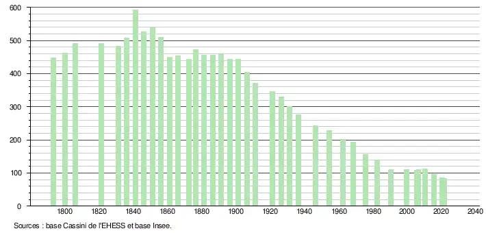 L'évolution du nombre d'habitants est connue à travers les recensements de la population effectués dans la commune depuis 1793. Pour les communes de moins de 10 000 habitants, une enquête de recensement portant sur toute la population est réalisée tous les cinq ans, les populations légales des années intermédiaires étant quant à elles estimées par interpolation ou extrapolation[18]. Pour la commune, le premier recensement exhaustif entrant dans le cadre du nouveau dispositif a été réalisé en 2005[19].