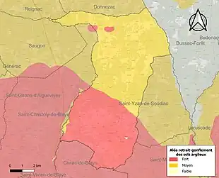 Le retrait-gonflement des sols argileux est susceptible d'engendrer des dommages importants aux bâtiments en cas d’alternance de périodes de sécheresse et de pluie. 99,9 % de la superficie communale est en aléa moyen ou fort (67,4 % au niveau départemental et 48,5 % au niveau national). Sur les 1 295 bâtiments dénombrés sur la commune en 2019, 1 294 sont en aléa moyen ou fort, soit 100 %, à comparer aux 84 % au niveau départemental et 54 % au niveau national. Une cartographie de l'exposition du territoire national au retrait gonflement des sols argileux est disponible sur le site du BRGM[23],[Carte 2].