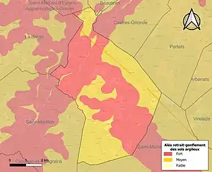 Le retrait-gonflement des sols argileux est susceptible d'engendrer des dommages importants aux bâtiments en cas d’alternance de périodes de sécheresse et de pluie. La totalité de la commune est en aléa moyen ou fort (67,4 % au niveau départemental et 48,5 % au niveau national). Sur les 1 103 bâtiments dénombrés sur la commune en 2019, 1 103 sont en aléa moyen ou fort, soit 100 %, à comparer aux 84 % au niveau départemental et 54 % au niveau national. Une cartographie de l'exposition du territoire national au retrait gonflement des sols argileux est disponible sur le site du BRGM[22],[Carte 2].