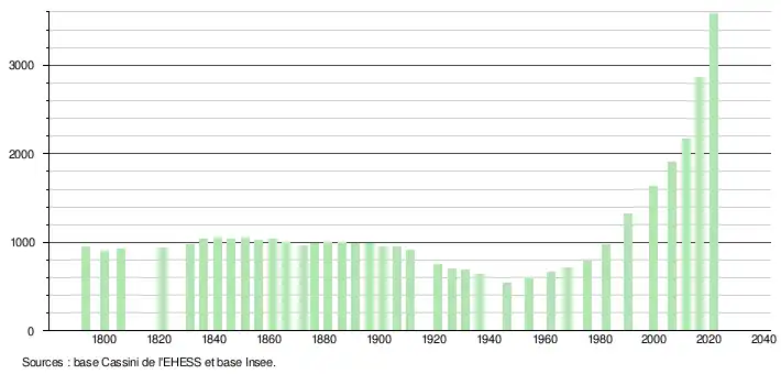 L'évolution du nombre d'habitants est connue à travers les recensements de la population effectués dans la commune depuis 1793. Pour les communes de moins de 10 000 habitants, une enquête de recensement portant sur toute la population est réalisée tous les cinq ans, les populations légales des années intermédiaires étant quant à elles estimées par interpolation ou extrapolation[30]. Pour la commune, le premier recensement exhaustif entrant dans le cadre du nouveau dispositif a été réalisé en 2006[31].