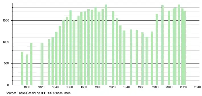 L'évolution du nombre d'habitants est connue à travers les recensements de la population effectués dans la commune depuis 1793. Pour les communes de moins de 10 000 habitants, une enquête de recensement portant sur toute la population est réalisée tous les cinq ans, les populations légales des années intermédiaires étant quant à elles estimées par interpolation ou extrapolation[18]. Pour la commune, le premier recensement exhaustif entrant dans le cadre du nouveau dispositif a été réalisé en 2008[19].