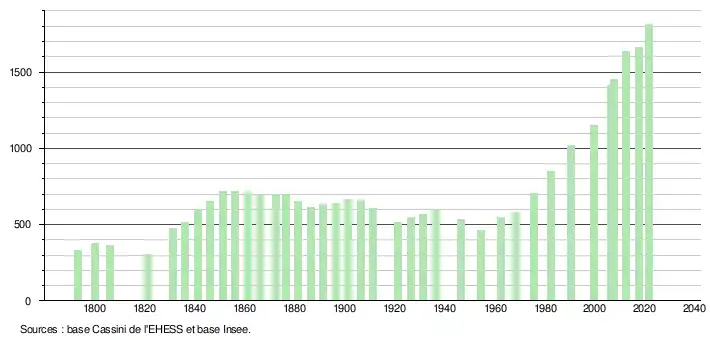 L'évolution du nombre d'habitants est connue à travers les recensements de la population effectués dans la commune depuis 1793. Pour les communes de moins de 10 000 habitants, une enquête de recensement portant sur toute la population est réalisée tous les cinq ans, les populations légales des années intermédiaires étant quant à elles estimées par interpolation ou extrapolation[18]. Pour la commune, le premier recensement exhaustif entrant dans le cadre du nouveau dispositif a été réalisé en 2007[19].