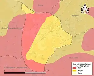 Le retrait-gonflement des sols argileux est susceptible d'engendrer des dommages importants aux bâtiments en cas d’alternance de périodes de sécheresse et de pluie. La totalité de la commune est en aléa moyen ou fort (67,4 % au niveau départemental et 48,5 % au niveau national). Sur les 419 bâtiments dénombrés sur la commune en 2019, 419 sont en aléa moyen ou fort, soit 100 %, à comparer aux 84 % au niveau départemental et 54 % au niveau national. Une cartographie de l'exposition du territoire national au retrait gonflement des sols argileux est disponible sur le site du BRGM[22],[Carte 2].
