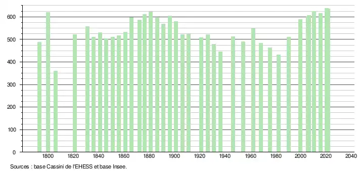 L'évolution du nombre d'habitants est connue à travers les recensements de la population effectués dans la commune depuis 1793. Pour les communes de moins de 10 000 habitants, une enquête de recensement portant sur toute la population est réalisée tous les cinq ans, les populations légales des années intermédiaires étant quant à elles estimées par interpolation ou extrapolation[18]. Pour la commune, le premier recensement exhaustif entrant dans le cadre du nouveau dispositif a été réalisé en 2005[19].
