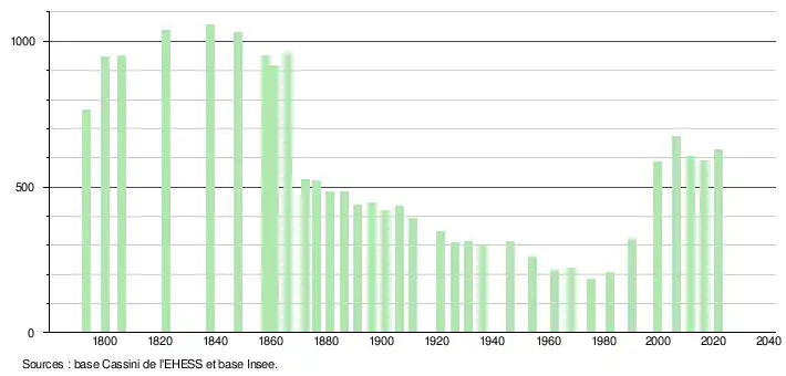 L'évolution du nombre d'habitants est connue à travers les recensements de la population effectués dans la commune depuis 1793. Pour les communes de moins de 10 000 habitants, une enquête de recensement portant sur toute la population est réalisée tous les cinq ans, les populations légales des années intermédiaires étant quant à elles estimées par interpolation ou extrapolation[12]. Pour la commune, le premier recensement exhaustif entrant dans le cadre du nouveau dispositif a été réalisé en 2006[13].