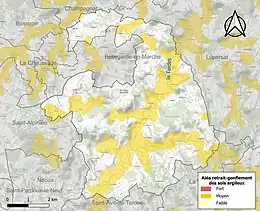 Le retrait-gonflement des sols argileux est susceptible d'engendrer des dommages importants aux bâtiments en cas d’alternance de périodes de sécheresse et de pluie. 29,7 % de la superficie communale est en aléa moyen ou fort (33,6 % au niveau départemental et 48,5 % au niveau national). Sur les 186 bâtiments dénombrés sur la commune en 2019, 56 sont en aléa moyen ou fort, soit 30 %, à comparer aux 25 % au niveau départemental et 54 % au niveau national. Une cartographie de l'exposition du territoire national au retrait gonflement des sols argileux est disponible sur le site du BRGM[16],[Carte 2].