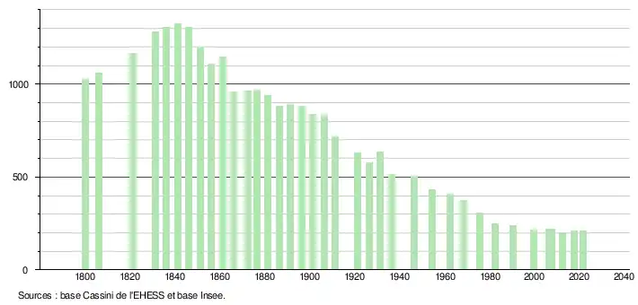 L'évolution du nombre d'habitants est connue à travers les recensements de la population effectués dans la commune depuis 1800. Pour les communes de moins de 10 000 habitants, une enquête de recensement portant sur toute la population est réalisée tous les cinq ans, les populations légales des années intermédiaires étant quant à elles estimées par interpolation ou extrapolation[19]. Pour la commune, le premier recensement exhaustif entrant dans le cadre du nouveau dispositif a été réalisé en 2007[20].