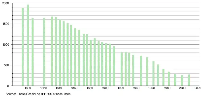 - Dans le tableau des recensements et le graphique, par convention dans Wikipédia, le principe a été retenu, pour les populations légales postérieures à 1999 de n’afficher dans le tableau des recensements et le graphique que les populations correspondant à l'année 2006, première population légale publiée calculée conformément aux concepts définis dans le décret no 2003-485 du 5 juin 2003, et les années correspondant à une enquête exhaustive de recensement pour les communes de moins de 10 000 habitants, ainsi que la dernière population légale publiée par l’Insee.